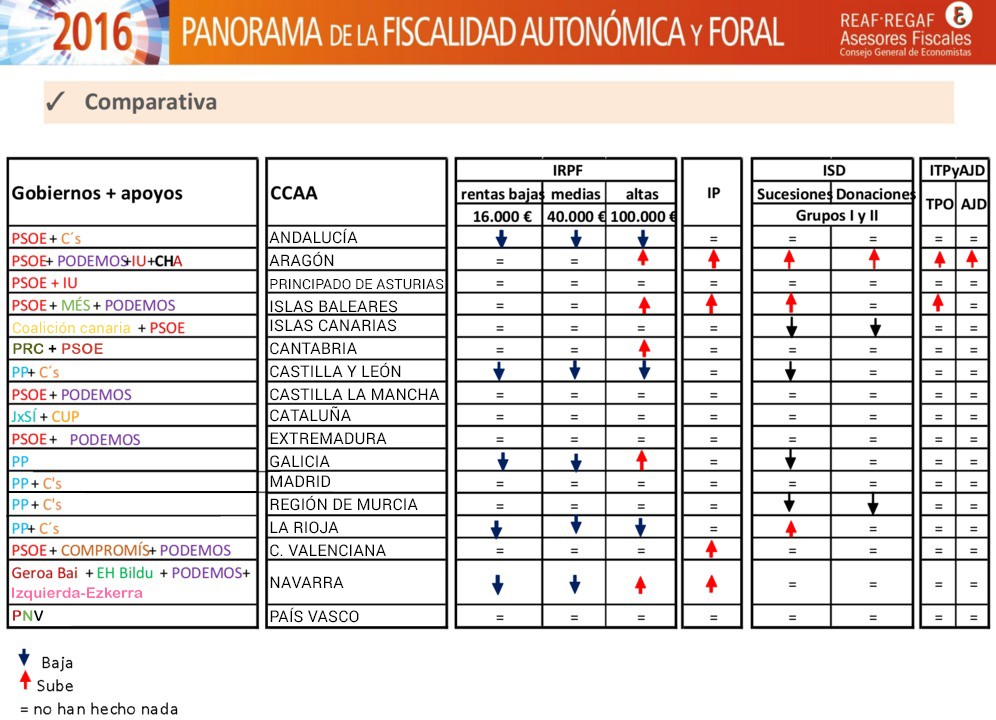Como se observa en el cuadro, el gobierno de Podemos, PSOE, IU y la Chunta Aragonesista (CHA) ha incrementado todos los principales impuestos de Aragón: IRPF (a las rentas de más de 100.000 euros), Patrimonio, Sucesiones, Transmisiones Patrimoniales y Actos Jurídicos Documentados. En las Islas Baleares, gobernadas por Podemos, PSOE y Més, suben los mismos tributos excepto el de Actos Jurídicos Documentados, que se mantiene igual.