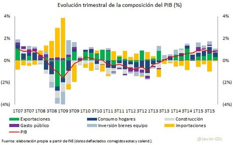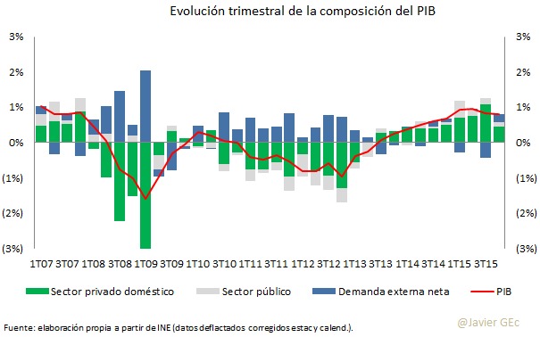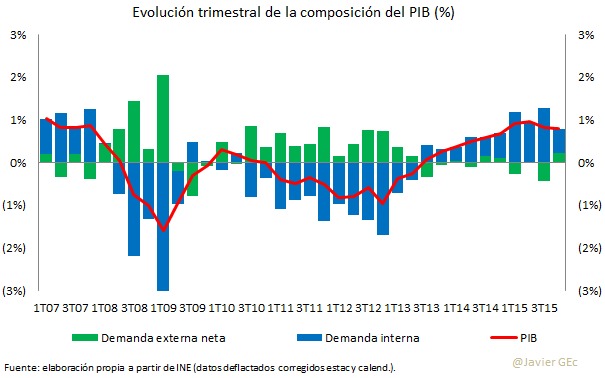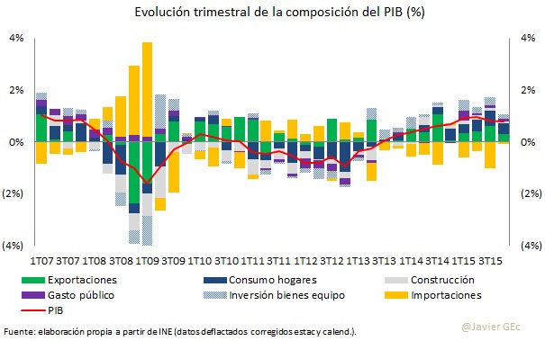 Esta sería la explicación técnica. Lo que hay detrás es una demanda tanto interna como externa que ya no es capaz de mantener su ritmo de crecimiento y que, al menos transitoriamente en el cuarto trimestre, se ha compensado vía menores compras en el exterior. Pero las importaciones de bienes no van a caer continuamente por lo que es previsible que el PIB se desacelere en 2016.