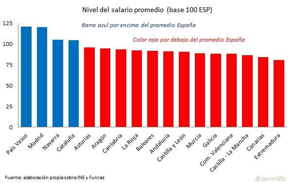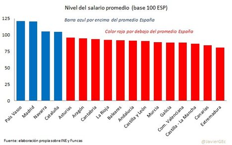 Según los conceptos del coste laboral que forman parte del salario –existen otros que o bien son ingresados al Estado como las cotizaciones o son excepcionales como son las indemnizaciones por despido– las comunidades con unos salarios más elevados son País Vasco, Madrid, Navarra y Cataluña. En el resto, el salario promedio se sitúa por debajo de la media nacional especialmente en Castilla-La Mancha, Canarias y Extremadura donde se encuentran los salarios más bajos.