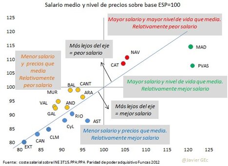 Por zonas geográficas, los asalariados en el arco mediterráneo y especialmente los residentes en las Islas Baleares soportan unos salarios relativamente más bajos. Algo similar ocurre en el noroeste, donde gallegos y cántabros obtienen unas nóminas más bajas que en la media. Por el contrario, los trabajadores asalariados del País Vasco y Asturias disfrutan de unas nóminas relativamente más elevadas. El segundo caso es especialmente significativo pues, pese a que sus salarios absolutos se sitúan por debajo de la media, un coste de la vida proporcionalmente aún más bajo permite disfrutar unos salarios corregidos algo más elevados que la media nacional.