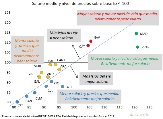 Para poder medir el nivel de vida, Funcas estimó con datos de 2012 el PPA o Paridad de Poder Adquisitivo por comunidad autónoma. Si se combina el nivel de salarios y de PPA sobre la media nacional se observa una elevada correlación que tiene su lógica –los precios serán proporcionalmente más elevados donde los salarios también lo sean–. Pero dicha correlación no es total.