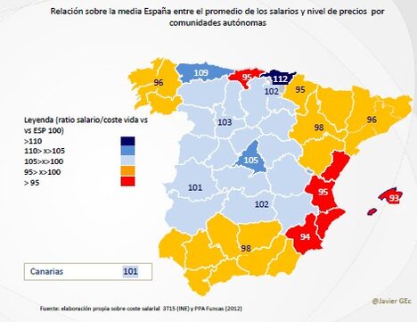 Ahora bien, el salario debe ponderarse por el nivel de precios, pues no es lo mismo ganar al mes 1.500 euros en Madrid que en Extremadura, donde el coste de la vida es sensiblemente inferior