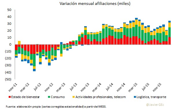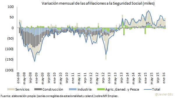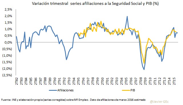En definitiva, el actual ritmo de creación de empleo -estimando el dato de afiliaciones de marzo- está en línea con el trimestre anterior y, por tanto, apunta un crecimiento del PIB también similar al registrado a finales de 2015 -un 0,8% en el cuarto trimestre-.