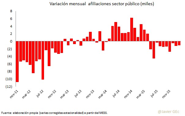 Por el contrario, el empleo en el sector público -incluye la administración y la obra pública, pero no Sanidad o Educación- actualmente baja tras el aumento observado al inicio del pasado año.