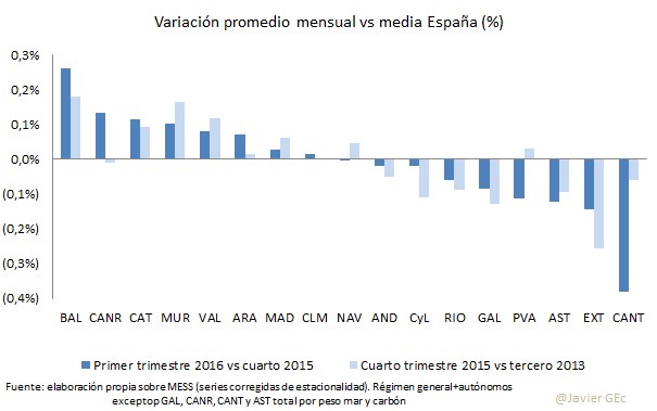 Por el contrario, Extremadura y Cantabria registran la peor evolución en los primeros meses de 2016. En el primer caso, el peso del empleo público es muy superior a la media nacional, mientras que en Cantabria son las manufacturas la actividad con un mayor peso relativo.