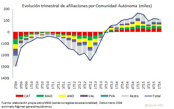 En cuanto a la evolución del empleo entre las principales comunidades -Cataluña, Madrid, Andalucía, Comunidad de Valencia y Andalucía, que explican unas tres cuartas partes del crecimiento total- no se observan grandes diferencias en el ritmo de crecimiento frente a los últimos meses de 2015.