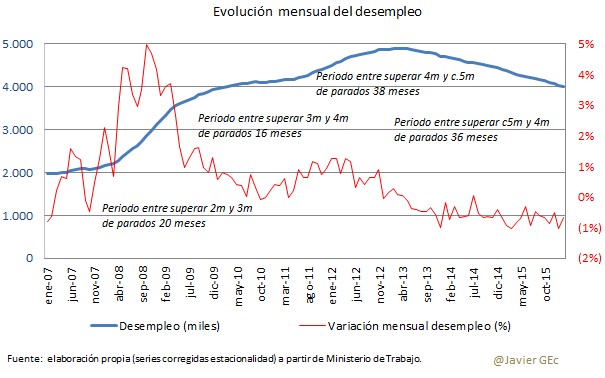 En la actual fase de recuperación, y considerando el nivel alcanzado en abril de 2013 como de cinco millones -en realidad, fue 4,9 millones-, habría pasado un periodo de 36 meses para poder bajar de los cuatro millones.