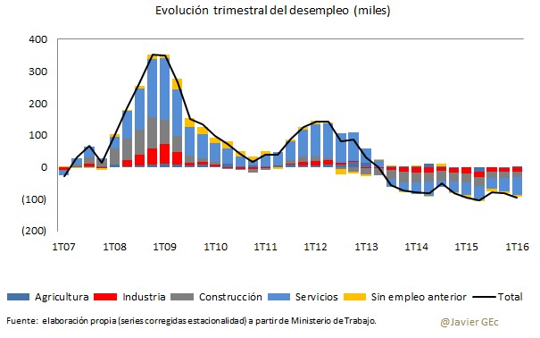 Una explicación de tal diferencia es que antiguos empleados en la Industria (su peso es del 8% del empleo creado, pero un 19% del descenso en el paro), y especialmente en la Construcción (5% y 33%, respectivamente), han encontrado un empleo en los Servicios tras caer en el paro.