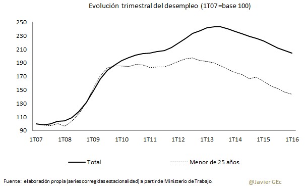En el primer trimestre de 2016, desempleo total y juvenil descienden un 2,3% en tasa trimestral, lo que puede indicar que, actualmente, es igual de sencillo -o complicado- encontrar empleo, con independencia de tener más o menos de 25 años.