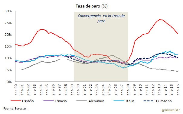 Con datos de Eurostat del mes de enero, la tasa de paro en España es del 20,5% en comparación con un 10,3% en la eurozona. Esto es un diferencial de 10 puntos porcentuales, que es más del doble si se compara entre los menores de 25 años.
