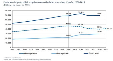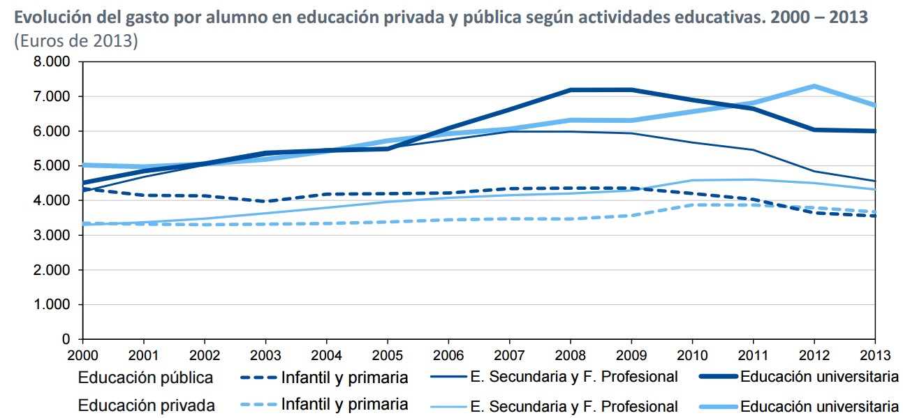 Lo llamativo es cómo han evolucionado las diferentes partidas. Mientras que el gasto privado ha ido creciendo de forma casi constante, con un repunte en los últimos años para compensar la reducción de las administraciones (por ejemplo, en las tasas universitarias); el gasto público tuvo un incremento enorme en los años de bonanza (de 2000 a 2007), luego se estabilizó y finalmente se ha desplomado desde 2009.