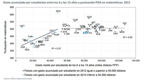 - ¿Gastamos bien?: ésta es la pregunta clave. El siguiente gráfico muestra los resultados de los países que se examinaron en la última edición de PISA en relación a su gasto acumulado por alumno entre los 6 y los 15 años (la edad en la que se les hace el examen de PISA).