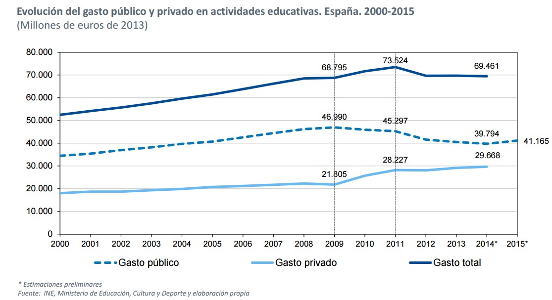 - ¿Cuánto gastamos?: En 2014, último año con cifras, los españoles nos gastamos un total de 69.461 millones en educación. Aquí entra todo, desde los presupuestos del Ministerio del ramo al gasto de las familias en actividades complementarias, pasando por lo que las empresas destinan a la formación de sus empleados.