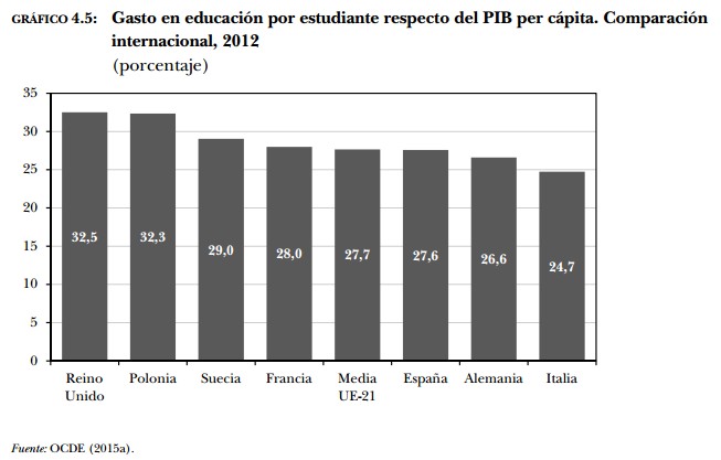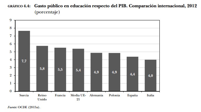 - ¿Gastamos poco?: ésta es otra queja recurrente. El problema en España sería que gastamos poco en educación en relación a nuestros vecinos. Así, normalmente se utiliza la ratio de gasto en función del PIB, tal y como aparece en el siguiente gráfico. España dedica el 4,4% de su PIB a esta cuestión, frente al 5,4% de media de la UE.