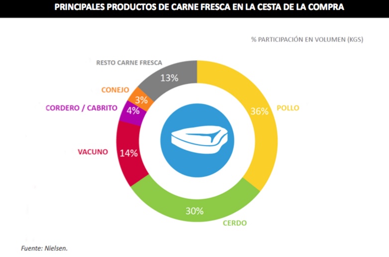 Sana, barata, sabrosa y con múltiples opciones de cocinado, así es la carne favorita de los españoles. El pollo es un año más la opción preferida de los consumidores y representa un 36% sobre el total de kilos de carne fresca consumidos, seguido muy de cerca por el cerdo (30%) y el vacuno (14%). Otros productos como el conejo o el cordero siguen sin conquistar la cesta de la compra de los españoles y se consumen de manera puntual con lo que apenas tienen una cuota del 4% según los datos del último informe de Nielsen.