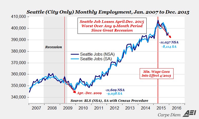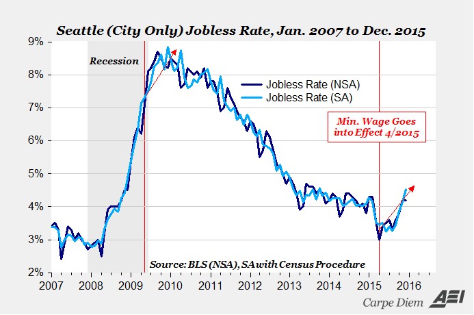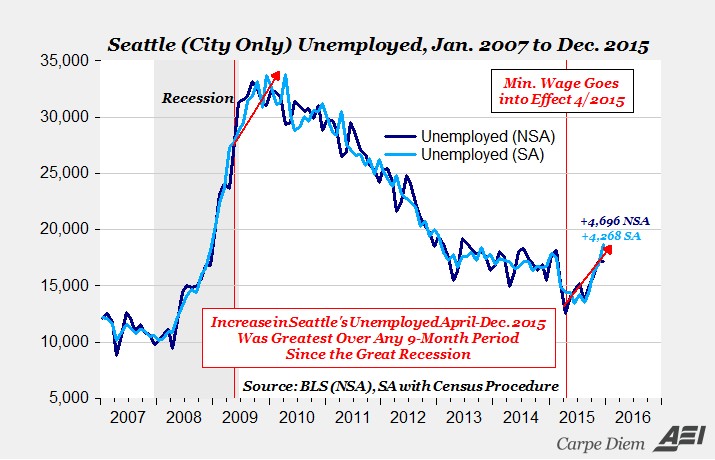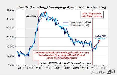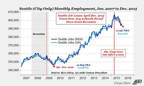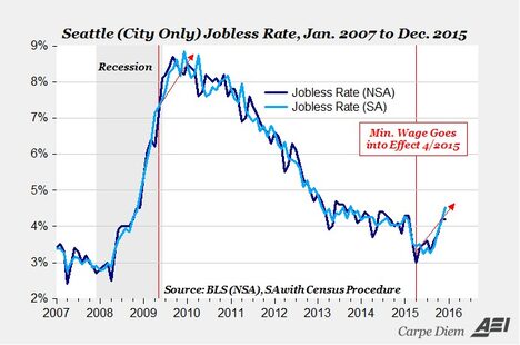 ¿Cuál ha sido el efecto de este sustancial aumento del SMI? Destrucción de empleo y subida del paro, tal y como explican desde American Enterprise Institute (AEI). Los datos oficiales de empleo muestran que la ciudad ha perdido más de 11.000 puestos de trabajo desde abril de 2015, el paro se ha incrementado en cerca de 5.000 personas y la tasa de desempleo ha crecido un punto porcentual.