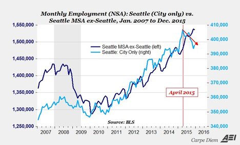 Y lo más significativo es que en los aledaños de la ciudad (línea azul oscuro), donde el nuevo salario mínimo no se aplica, el empleo ha crecido en 57.000 puestos de trabajo adicionales durante entre abril y finales de 2015, hasta alcanzar un nuevo récord histórico, lo cual evidencia de forma aún más clara el perverso efecto del salario mínimo en esta ciudad.