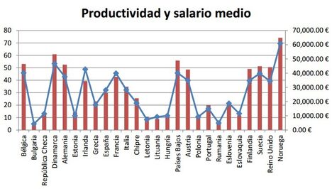 Podemos y el resto de partidos y agentes que defienden disparar el SMI en España no entienden que la retribución de los trabajadores (columnas en rojo) no depende de una decisión política, es decir, no se puede imponer por ley, sino que depende de la productividad (línea azul).