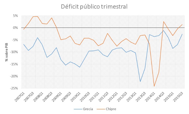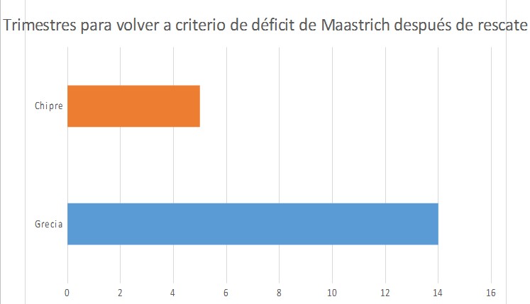 En contraste, Chipre recibe su primer rescate en marzo de 2013 y su déficit público vuelve a niveles inferiores al 3% en el segundo trimestre de 2014. Es decir, tarda 5 trimestres en volver a un nivel aceptable de déficit público. Actualmente, registra un superávit presupuestario del 2,9% del PIB.