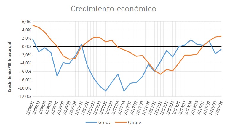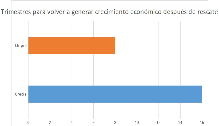 Grecia tarda 16 trimestres desde su primer rescate en volver a registrar crecimiento económico. Estos crecimientos han sido efímeros y, de hecho, han vuelto a la senda negativa tras el Gobierno de Syriza. Por contraste, los chipriotas consiguen crear crecimiento en la mitad de tiempo, necesitando tan sólo 8 trimestres desde su rescate para empezar a registrar tasas positivas.