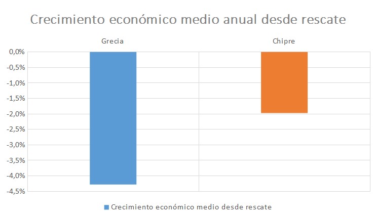 Adicionalmente, el crecimiento medio del PIB desde que cada país pide el rescate es muy dispar. La economía griega ha caído una media del 4,3% anual desde que pidió su primer rescate, mientras que la chipriota ha caído un 1,9% anual.