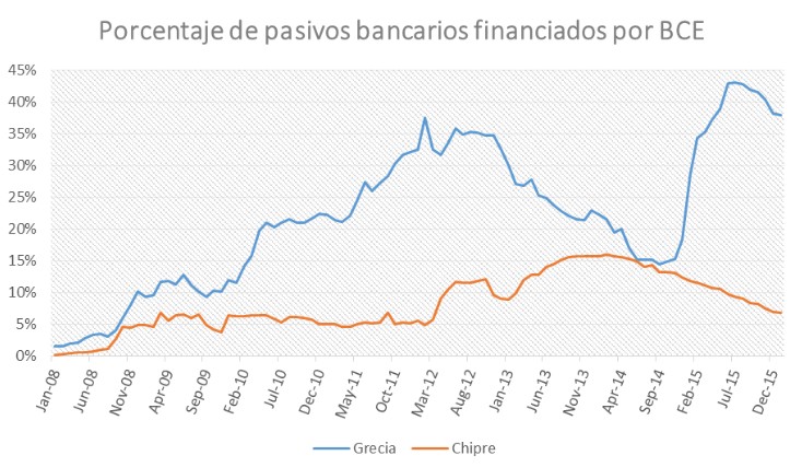 Especialmente interesante es observar cómo el sistema financiero chipriota se encuentra actualmente en una situación más estable que el griego a pesar de que tanto su peso en la economía como su importancia a la hora de desestabilizar la economía de Chipre fue mucho mayor que su contraparte griega. La financiación por parte del BCE a bancos nacionales, que ocurre generalmente cuando nadie más confía en los bancos, es mucho mayor en Grecia que en Chipre.