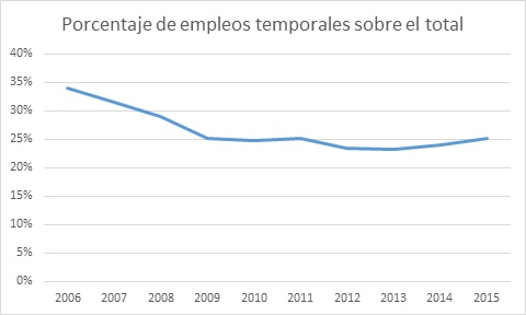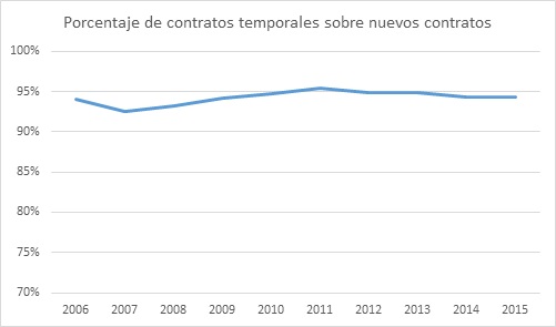 En este sentido, por cierto, la tasa de temporalidad sobre los nuevos contratos temporales apenas ha variado durante la crisis o tras la reforma laboral. Es decir, aunque el porcentaje de empleo temporal ha pasado del 35 al 25% entre 2006 y 2015, los contratos temporales siguen copando cerca del 95% de todos los nuevos contratos.