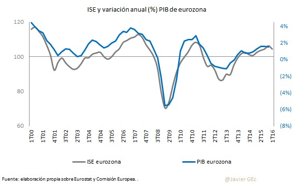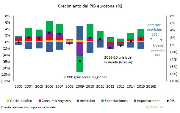 La entidad monetaria rebajó sus previsiones de crecimiento desde el 1,7% al 1,4% para 2016. Aunque apenas son tres décimas, esta reducción marca la diferencia entre una mejora de tendencia o una desaceleración sobre 2015. Desde la gran recesión de 2009, la eurozona no ha sido capaz se sostener una clara recuperación y ha alternado años de moderado crecimiento con otros de caída en el PIB.