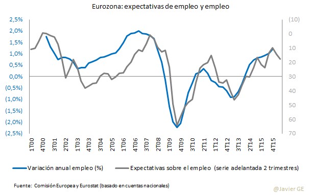 Sin embargo, el problema aquí es que las expectativas laborales en la zona euro tampoco son muy prometedoras y, de hecho, apuntan a un menor crecimiento en la primera mitad de 2016, según refleja la última encuesta de Bruselas a este respecto.