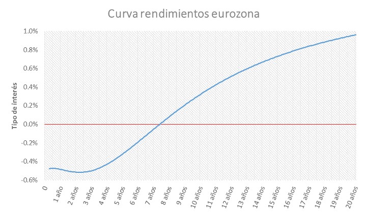 Efectivamente, vemos que la curva de tipos de bonos públicos AAA de la eurozona se encuentra en terreno negativo para todos los títulos con duración inferior a 7 años y 5 meses.