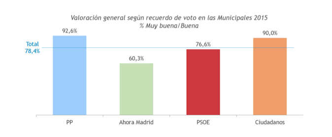 También por color político queda claro que el apoyo es unánime: entre los votantes del PP llega al 92,6% y entre quienes introdujeron la papeleta de Ahora Madrid alcanza el 60,3%. Por su parte, el 76,6% de quienes votaron al PSOE y el 90% de quienes optaron por Ciudadanos en las municipales de 2015 valoran positivamente la propuesta de transformación de la Castellana.