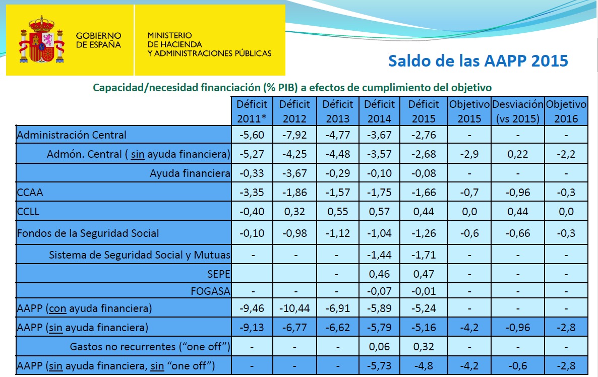 De esta forma, en 2015, según las cifras de Hacienda, sólo Canarias, Galicia y País Vasco tuvieron un déficit inferior al 0,7% del PIB al que estaban obligadas. En el lado contrario, las comunidades con más déficit son Cataluña (-2,70%), Extremadura (-2,64%), Murcia (-2,52%) y Valencia (2,51%). Montoro ha sido especialmente duro con Cataluña y Valencia, a las que ha acusado de acumular la mitad del incumplimiento total y a las que ha advertido: "Los nuevos gobiernos sólo hablan de gastar, cada vez que llegan a un acuerdo es para gastar más. Parece que el consenso sólo sirve para hacer anuncios de gasto y eso perjudica a la recuperación económica".