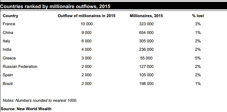 Francia lidera la lista de salida de millonarios en 2015, con cerca de 10.000 grandes fortunas (el 3% del total), seguido de China (9.000), Italia, India, Grecia, Rusia, España y Brasil. Aparte de Francia, destaca especialmente el caso de Grecia, tras perder el 5% de sus grandes fortunas (más de un millón de euros), según el último estudio elaborado al respecto por New World Wealth.