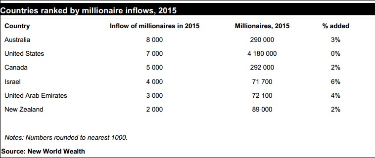 Australia fue el país que recibió más millonarios en 2015, con casi 8.000, un 3% más, seguido de EEUU, Canadá, Israel, Emiratos Árabes Unidos y Nueva Zelanda.