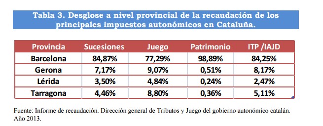 Así, prácticamente de cada 10 euros que se recaudan en Cataluña de los grandes impuestos estatales, 9 se pagan en Barcelona. Algo similar ocurre con los principales tributos autonómicos propios del gobierno catalán. En este caso la proporción de impuestos recaudados en Barcelona respecto al total de Cataluña supera el 84% en el caso del impuesto de Sucesiones, el 77% en el tributo del juego, el 84% en el caso de los impuestos de Transmisiones Patrimoniales y Actos Jurídicos Documentados y llega a alcanzar casi el 99% en el de Patrimonio.