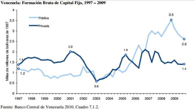 Sin embargo, la política intervencionista del movimiento chavista continuó su camino hasta la actualidad. Como se puede apreciar en el siguiente gráfico, la Formación Bruta de Capital Fijo, es decir, el valor de las adquisiciones de activos fijos, muestra una clara predominancia en este ámbito del sector público sobre el privado y una caída muy notable de este último a raíz del Programa Económico de Transición 1999-2000 de Hugo Chávez.