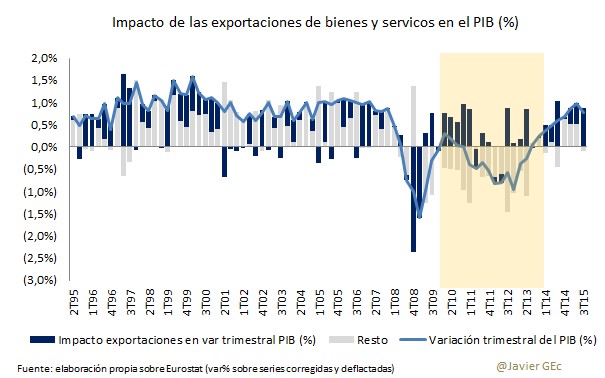 Las exportaciones explican en buena medida la reciente recuperación del PIB, y con anterioridad sirvieron para compensar parcialmente el descenso de la demanda interna. En concreto, en el periodo comprendido entre 2010 y 2013, las exportaciones crecieron un 13% en comparación con una caída del PIB del 5%.