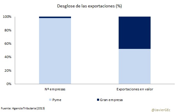El peso de las pymes en las exportaciones es inferior a lo que éstas suponen en la economía española. El 99,8% de las empresas son pymes y producen el 63% del PIB. Esto significa que la propensión a exportar en las pymes es inferior a la de las grandes empresas. Es algo lógico si se considera su menor tamaño.