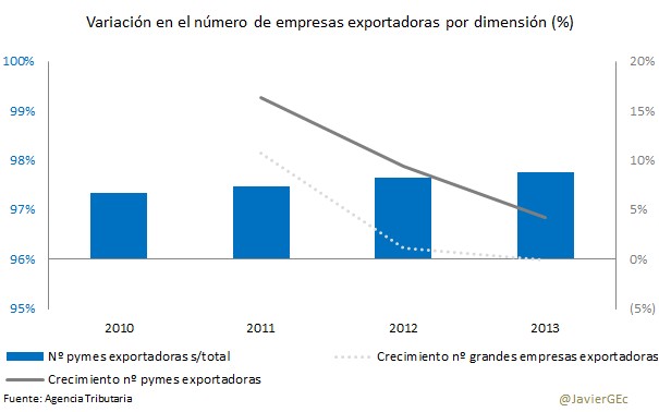 En definitiva, el número de pymes exportadoras crece en los últimos años. Además, su peso en el aumento de las exportaciones es también destacable, explicando el 30% del total en 2013.