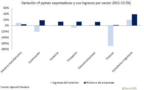 ¿Por qué esa diferencia entre mayor número de empresas que exportan y su menor cifra de ventas?. El detalle por sector muestra que son los servicios, con la excepción de los de consultoría e ingeniería, donde más ha crecido el número de pymes exportadoras, pero al mismo tiempo su cifra de ingresos con el exterior ha descendido, en especial en el sector financiero. Por el contrario, los ingresos de las pymes en la industria crecen.