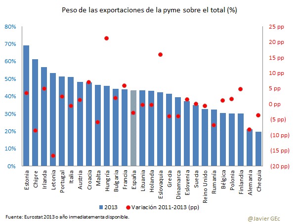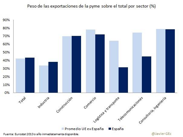Dentro de la UE, existe un amplio rango que va del 21% en Alemania, probablemente influido por el elevado peso de las exportaciones de bienes de equipo con empresas de gran escala, a un 57% en Irlanda, elevado peso de las pymes, donde puede residir una de las claves del éxito exportador de su economía. Ahora bien, el peso de las pymes en las exportaciones españolas ha descendido un 2% en los últimos años, cuando en el resto de países ha crecido un 0,5%.