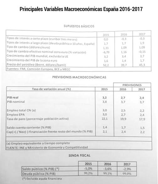 Guindos ha afirmado que la flexibilización del déficit público un año más para situarlo en el 3,6 % en 2016 era necesaria para evitar un "ajuste presupuestario muy intenso" y un grave impacto en el crecimiento económico. En este sentido, ha insistido en que la reducción del déficit es inevitable: "No porque estemos obligados por los procedimientos europeos, sino porque nuestra deuda pública ha alcanzado niveles muy elevados".