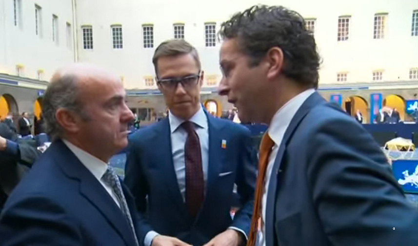 De Guindos ha asegurado que el país se encamina a elecciones y que, aunque cree que habrá un resultado similar a los anteriores comicios, espera que se imponga el "sentido común" para formar un Gobierno. El socialista holandés ha ironizado después afirmando que podría funcionar una coalición de partidos de izquierdas y derechas, a lo que el De Guindos ha reaccionado con una carcajada.