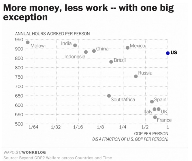 En algunas ocasiones, la adicción al trabajo o el exceso de horas se justificaba con las posesiones. "En Francia tienen 5 semanas de vacaciones y trabajan 35 horas semanales, pero los estadounidenses tenemos televisiones de pantalla plana, bocadillos (footlongs) por 5 dólares y coches grandes." A esto hay que añadir que Francia tiene solo un 67% del PIB de EEUU. ¿Quién vive mejor en realidad?