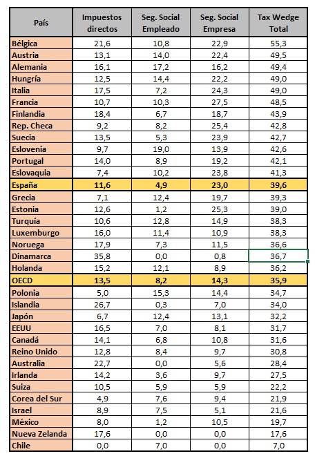 - Las cotizaciones 'escondidas': el último aspecto que hay que destacar tiene que ver con las cotizaciones sociales. Lo apuntábamos al comienzo del artículo: de los 39,6 puntos que cada trabajador paga de media en impuestos al trabajo en España, 11,6 llegan de impuestos directos, 4,9 de cotizaciones del trabajador y 23 se abonan vía cotizaciones sociales a cargo de la empresa (en realidad, los porcentajes de las cotizaciones para el salario base son incluso algo más elevados, pero para la estadística, incluyendo todos los conceptos, la OCDE ofrece estos datos). Este 23% es una cifra que mucha gente desconoce. Pero incluso los que saben que estos porcentajes son tan altos no es sencillo que traduzcan en dinero cuánto suponen estos costes a sus empresas. Por eso, puede que haya quien crea que los impuestos al trabajo en España son más reducidos que en otros países, en parte porque no se cuenta este enorme coste que soporta el empleador. Del mismo modo, la cuenta sobre el sueldo bruto se hace sin contar esta cantidad, lo que tampoco es muy realista, porque para el empresario lo relevante es cuánto le cuesta un trabajador y no cómo se reparte ese coste. En este sentido, numerosos expertos piden se regule por ley que las nóminas de los trabajadores incluyan también un apartado con estos costes, para que todos seamos conscientes de cuál es la diferencia entre lo que paga la empresa y lo que recibimos en la cuenta bancaria. Además, sería una medida sin coste, que sólo aumentaría la información en poder del ciudadano. Pero a pesar de todo, no parece que ninguno de los grandes partidos esté pensando en aprobar algo así.