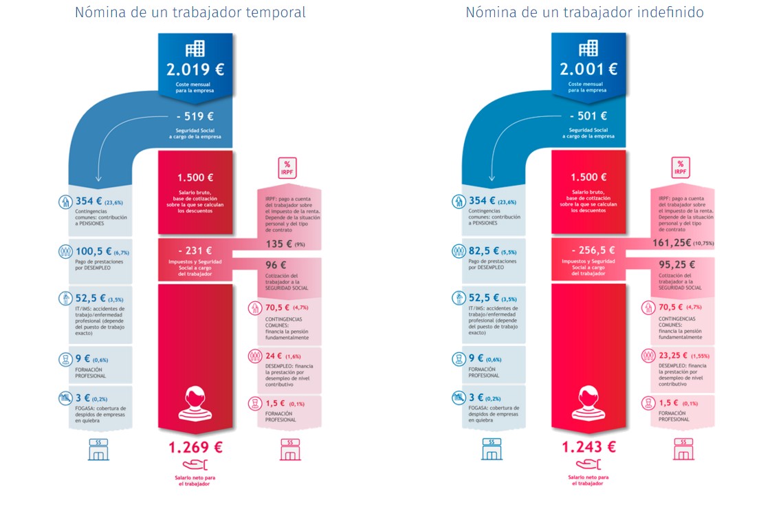 En la siguiente infografía elaborada por Wolters Kluwer puede verse cómo se distribuyen las cuantías en un salario bruto mensual de 1.500 euros (en contrato indefinido y temporal) para un trabajador soltero, sin hijos y sin otras situaciones excepcionales. También, aunque no aparece en la nómina, ha realizado un desglose del coste para la empresa de pagar ese salario.