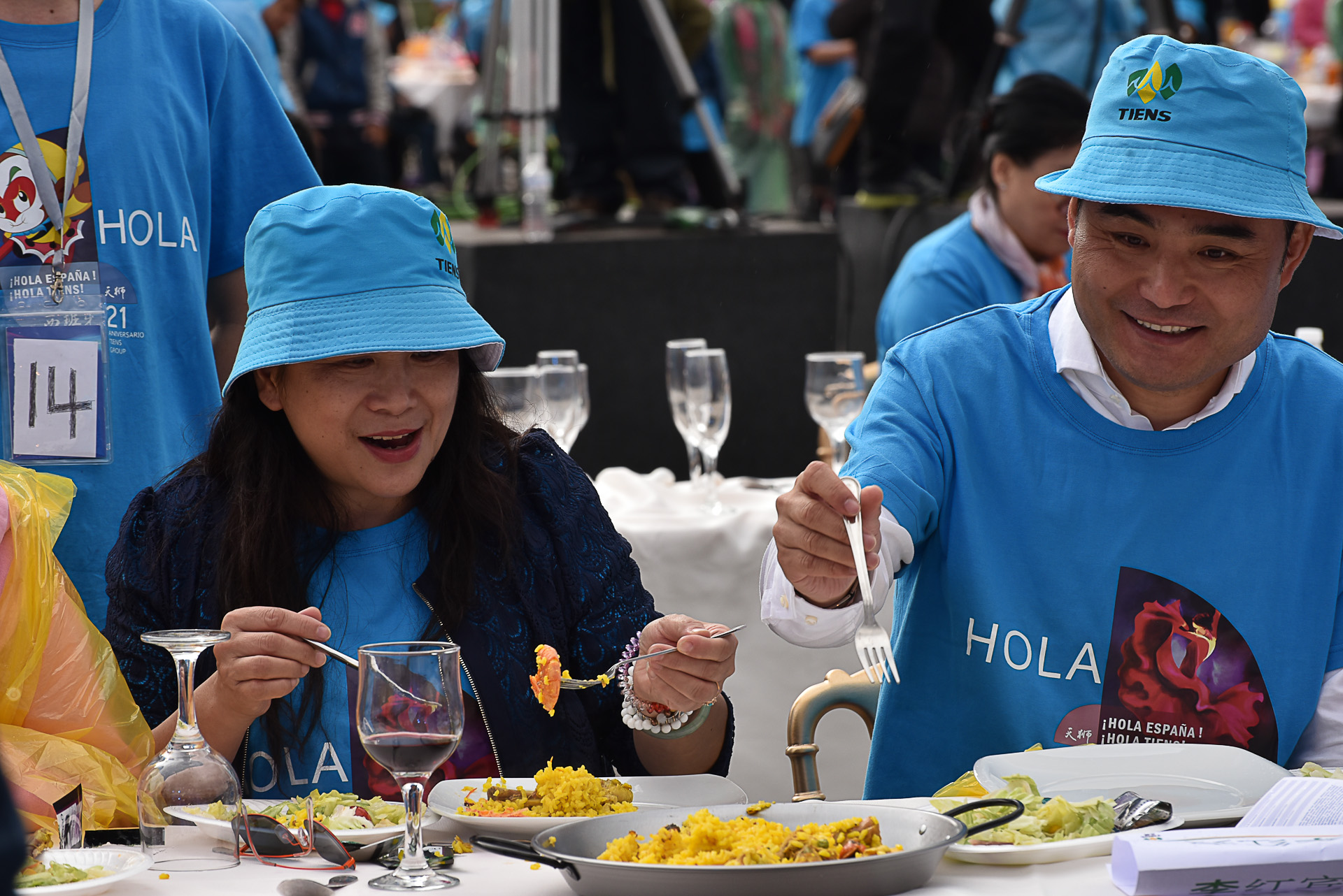 Dos trabajadores de Tiens disfrutan de un buen plato de paella.