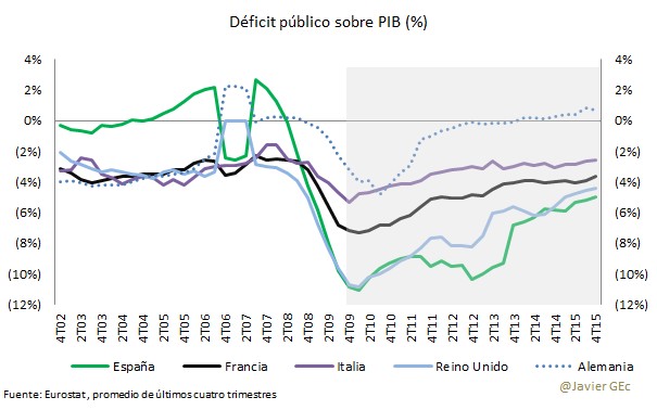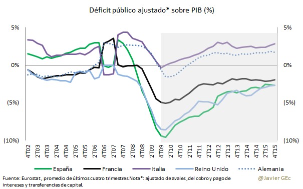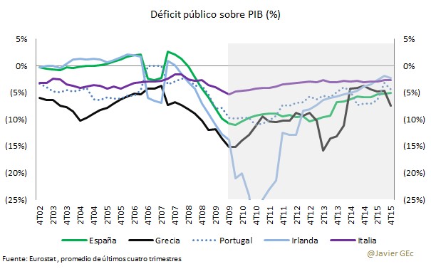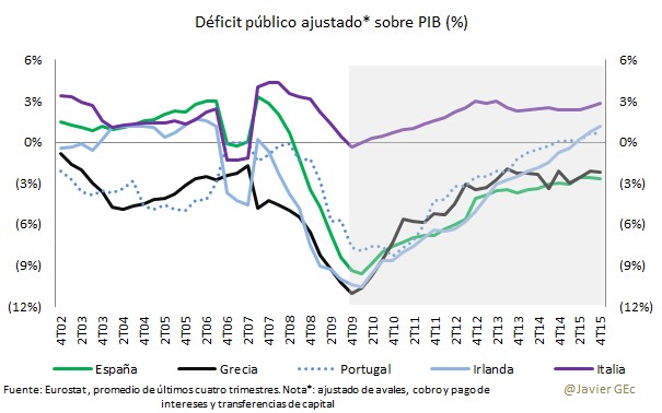 Entre los periféricos, en el inicio de la crisis de 2010, y con la excepción de Italia, que soporta una elevada carga de interés por su elevada deuda, sus economías partían de niveles de déficit similares. Sin embargo, cinco años después, mientras Portugal e Irlanda alcanzan un superávit ajustado, en los casos de Grecia y España la reducción del déficit ha sido mucho más lenta.
