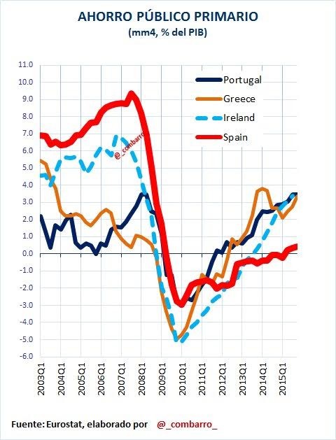 Para un mejor análisis de la evolución del déficit público habría que seleccionar sólo aquellas partidas en los que el margen la acción del Gobierno es mayor. Un buen punto de partida es el siguiente gráfico de @_combarro_, donde se analiza la evolución del ahorro público primario sobre el PIB -definido como ingresos menos gastos corrientes, una vez excluido el gasto en intereses-.