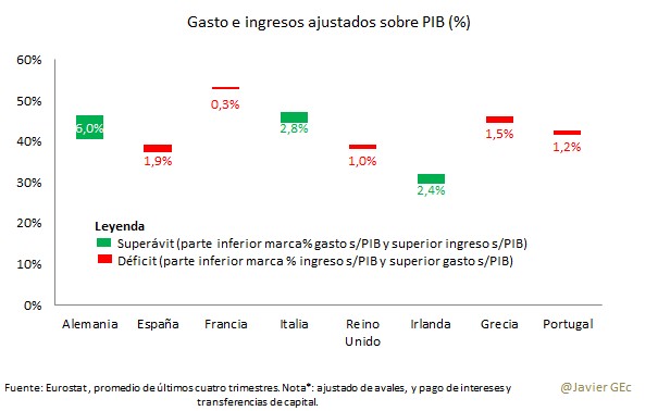 En este caso, se ajusta el saldo público de transferencias de capital y pago de intereses, al tratarse de partidas que poco tienen que ver con las medidas que un gobierno pueda implementar cada año. Los intereses son una "herencia" de la deuda acumulada, las transferencias de capital -como, por ejemplo, los rescates bancarios-, son también partidas excepcionales, no ordinarias. Entre las principales economías de la UE, España y Reino Unido son lo que, actualmente, sufren un mayor déficit público.